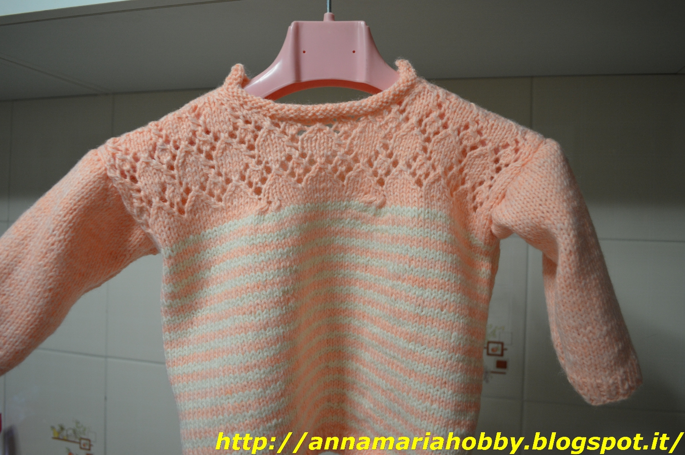 ho lavorato poi con il ferro n. 3,5 a m. rasata per 30 ferri alternado il filo col. salmone al bianco